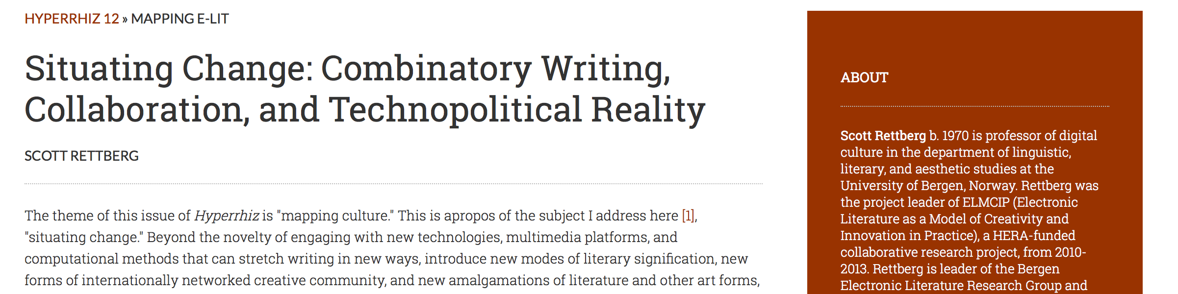 “Situating Change: Combinatory Writing, Collaboration, and Technopolitical Reality.” Hyperrhiz 12, 2015.