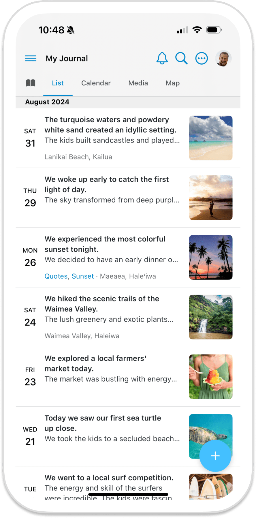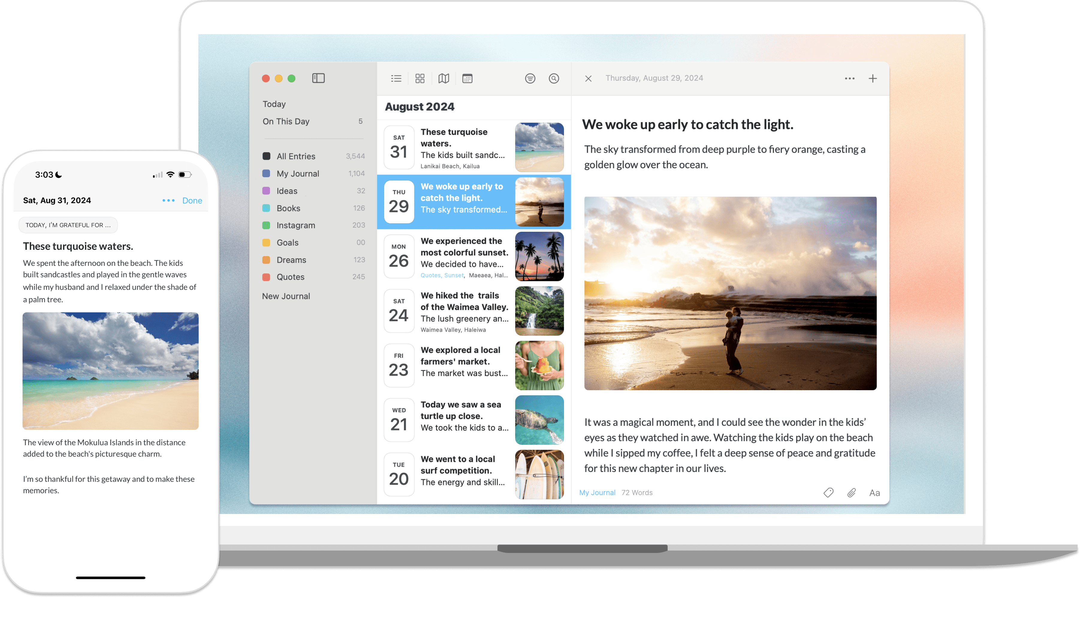 Download the free Day One journal app for free on iPhone, Android, iPad, Mac, and Apple Watch. Or access your Day One Journal from any browser.