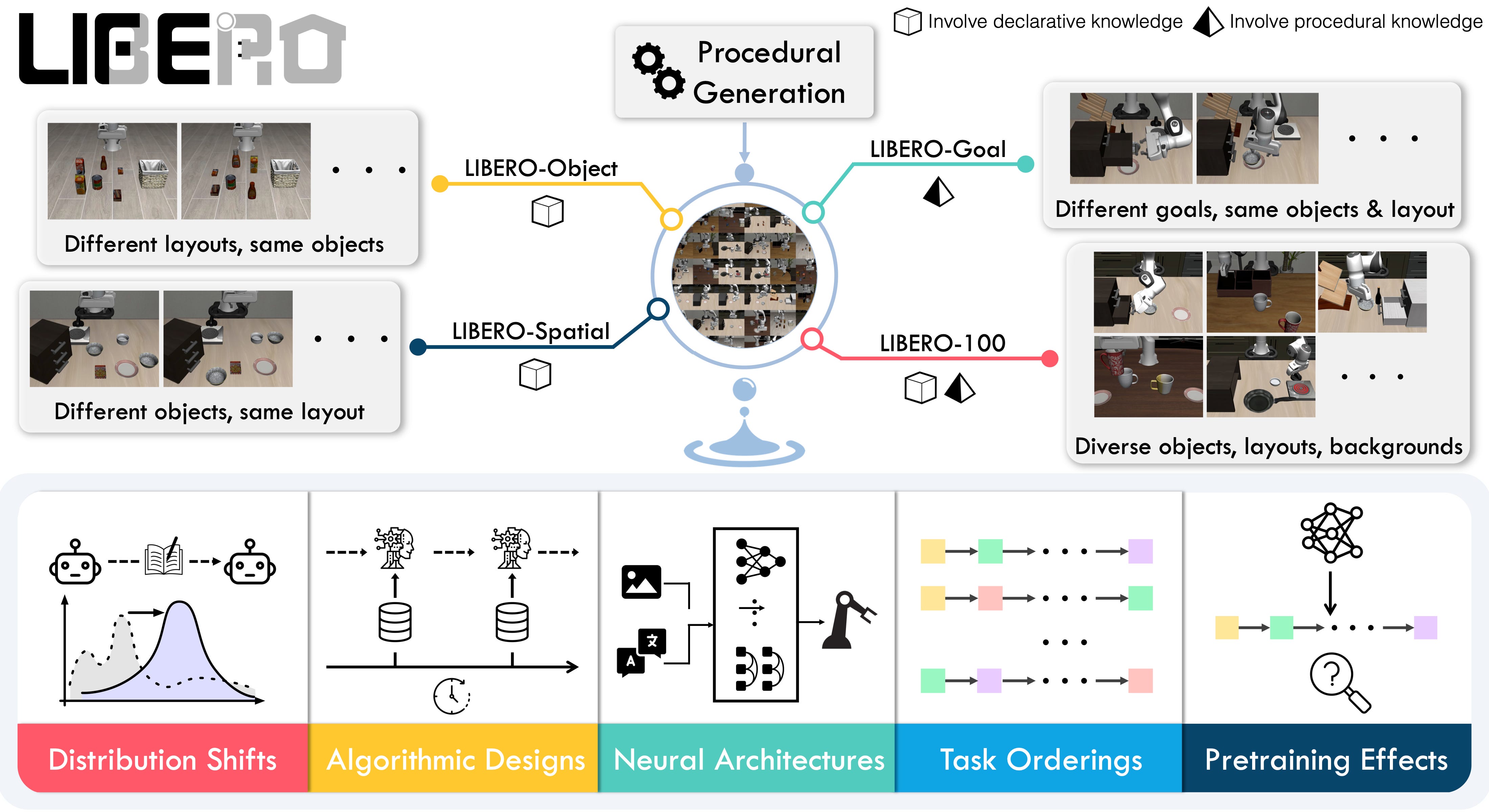For robotics manipulation, two of the most notable benchmarks are Libero and Calvin. These implement a wide range of tasks with language conditioning (“push the button", “stack the blocks”), which means they can be used to train and evaluate multi-task policies. For mobile robotics tasks, the most notable simulation benchmark is Behavior 1k, which implements a thousand challenging simulated household tasks.