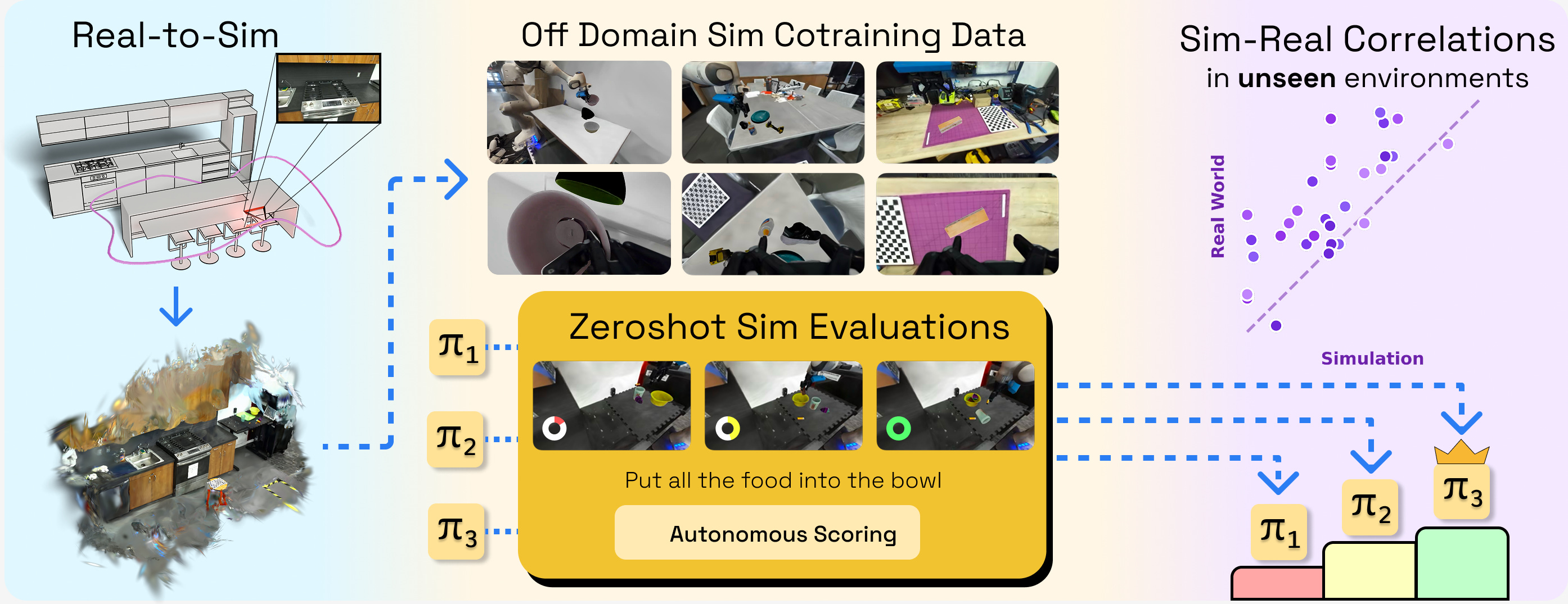 A benchmark specifically aimed at sim-to-real correlation. Scan an environment with your phone, use Gaussian splatting to construct a scene, and use a set of tools to create a photorealistic simulation. Ships with a set of “real-to-sim” environments in which performance correlation with the real world was validated.
