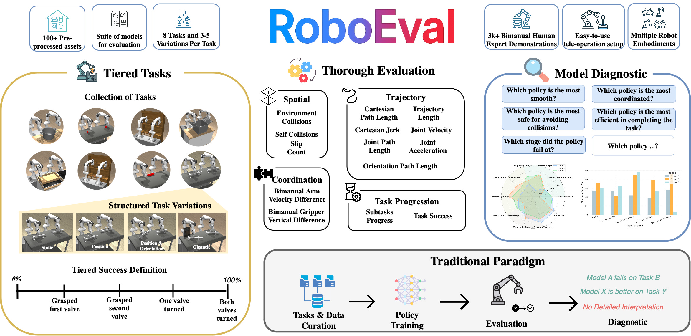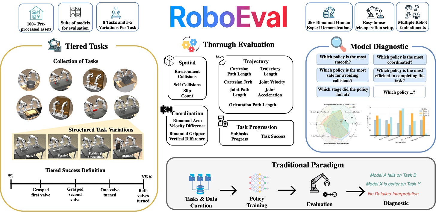 There are a lot of benchmarks and datasets out there; comparatively few (1) have gotten real uptake, and (2) show some actual correlation with real-world results. This is still an active area, and I personally am very excited about potential for real-world benchmarking like RoboArena (though it’s very expensive).