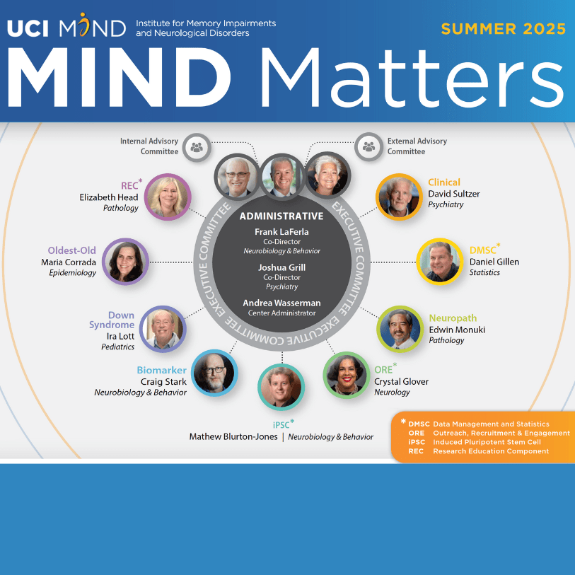 Welcome to the UC Irvine Institute for Memory Impairments and Neurological Disorders (UCI MIND). We are the University’s center for aging and dementia research, with our faculty seeking to understand the causes leading to neurological disorders such as Alzheimer’s disease, frontotemporal dementia, Lewy body dementia, and Huntington’s disease. For more than 30 years, UCI MIND has been at the forefront of Alzheimer’s disease research. It is home to one of the NIH-funded Alzheimer’s Disease Research Centers in the United States and is the only Center in Orange County.